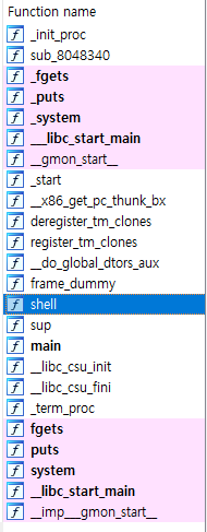 좌측에 shell이라는 이름은 가진 함수가 있었고 코드를 보니 /bin/dash를 실행시켜주는 역할을 했다.